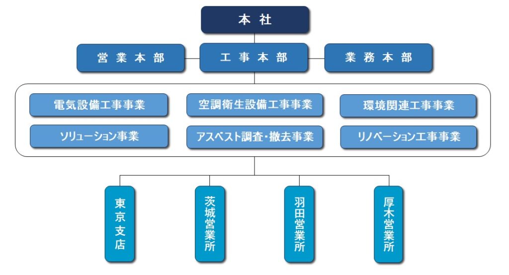 営業種目 | ・電気設備工事 ・空調設備工事 ・給排水衛生工事 ・電気通信工事 ・解体工事 ・アスベスト除去工事 ・環境対策工事 ・建築内装工事 ・建築設計デザイン |